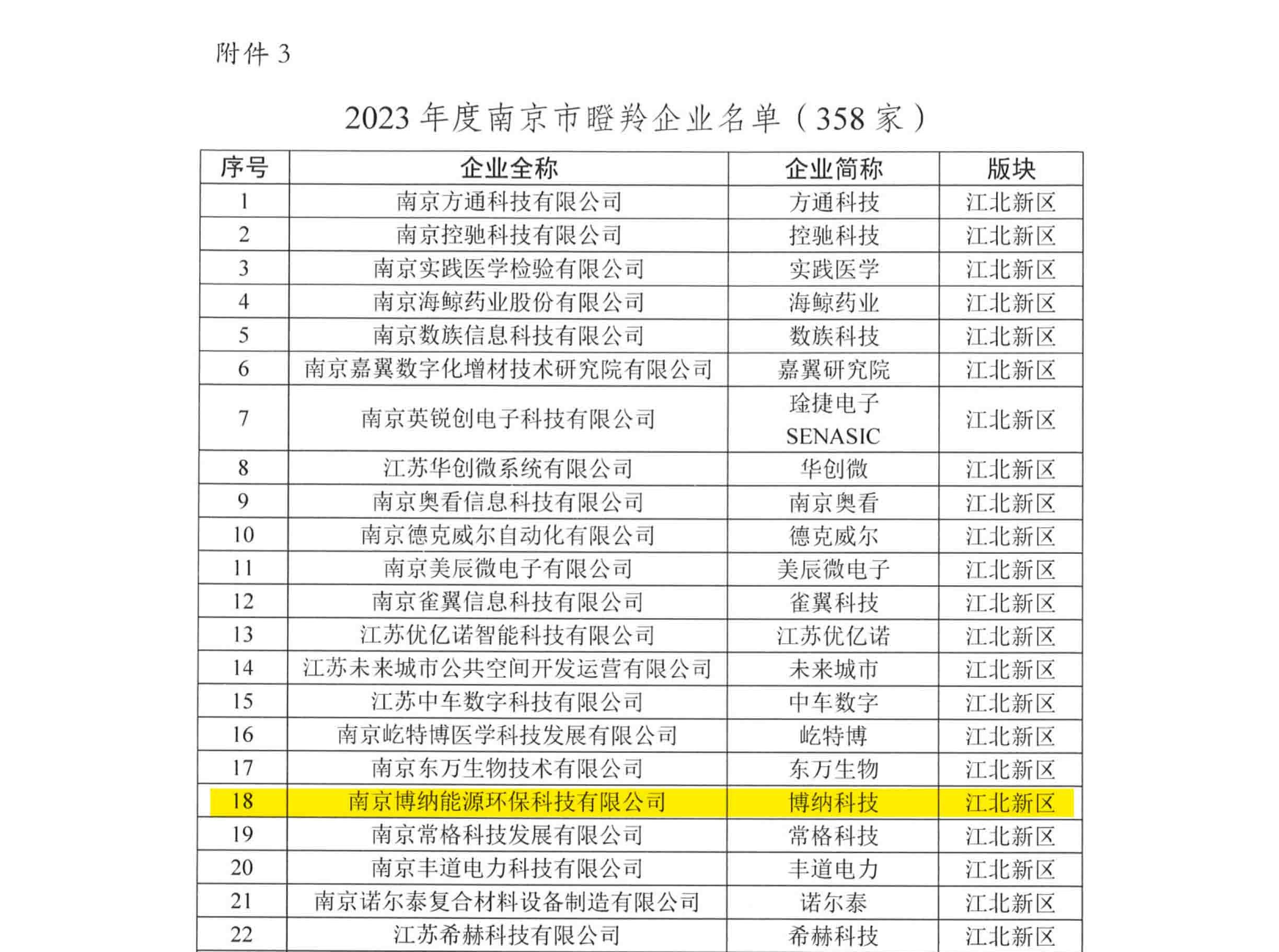 2023年12月25日,南京市宏觀經濟研究中心發布了2023年度獨角獸、培育獨角獸、瞪羚企業名單。博納科技繼2021年度、2022年度之后,連續第三年入選“南京市瞪羚企業”。