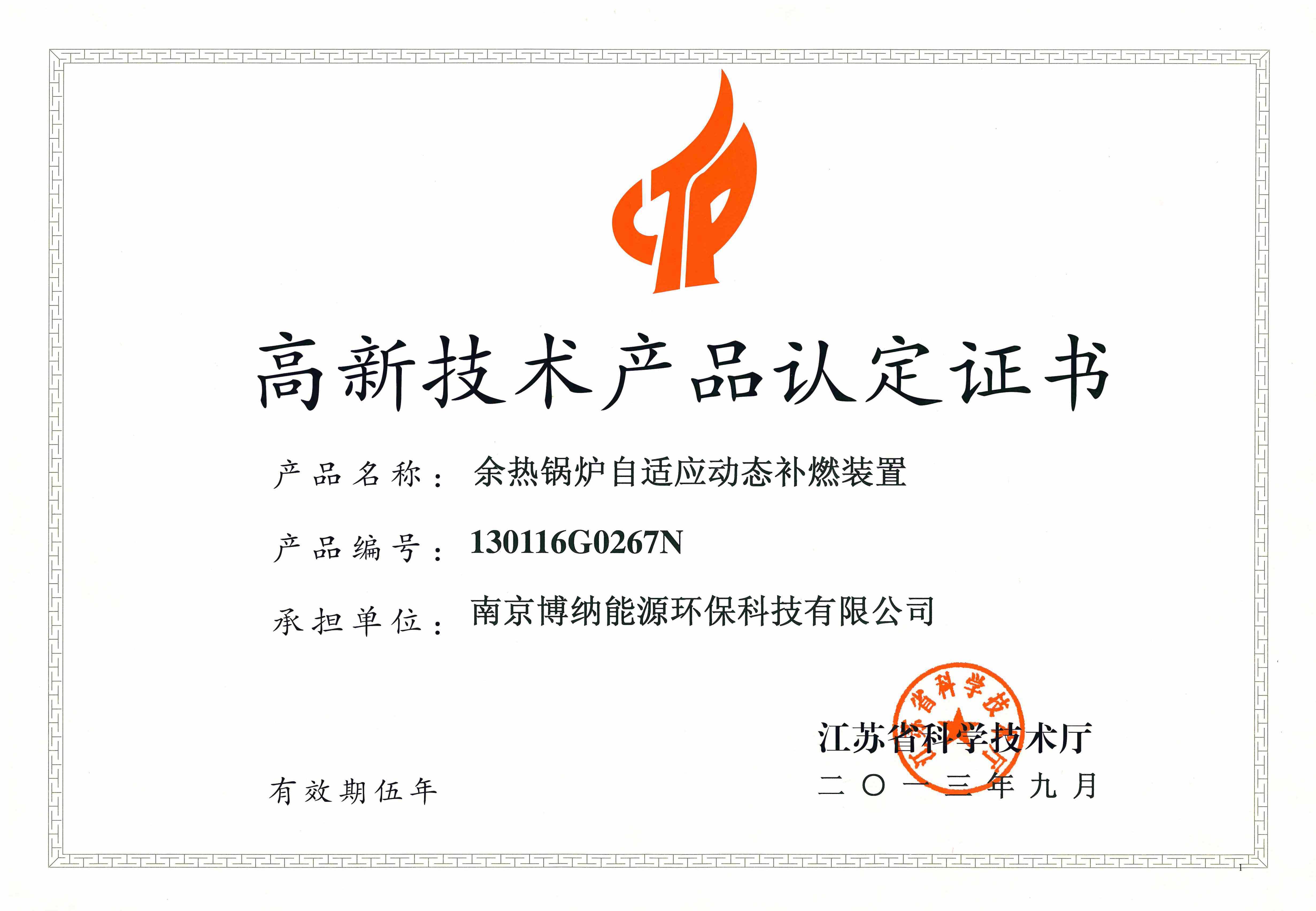 博納科技余熱補(bǔ)燃裝置通過2013年江蘇省高新技術(shù)產(chǎn)品認(rèn)定
